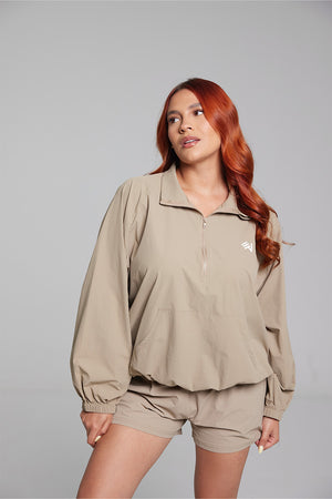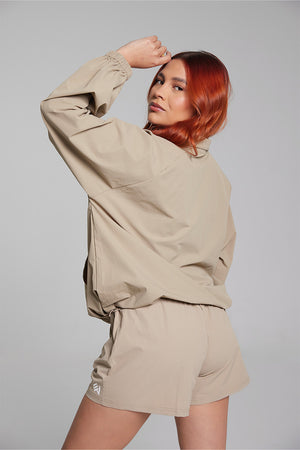 Set casual compuesto por chaqueta y short, confeccionado en tela impermeable, suave y ligera. Diseñado para brindar comodidad y un look moderno y funcional.